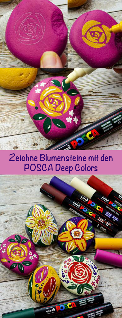 Steine bemalen macht so viel Spass, aber es kann auch etwas chaotisch sein. Hier ist eine saubere Methode, Steine mit Blumenmotiven zu verzieren. Mit den POSCA Farbmarkern können Sie die Steine direkt mit Ihren Stiften beschriften und so das Chaos vermeiden.
