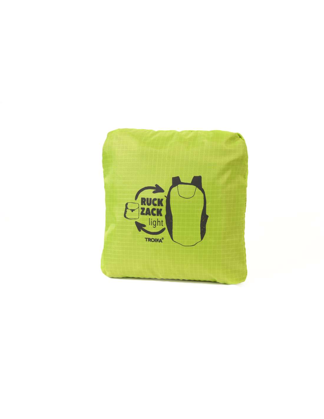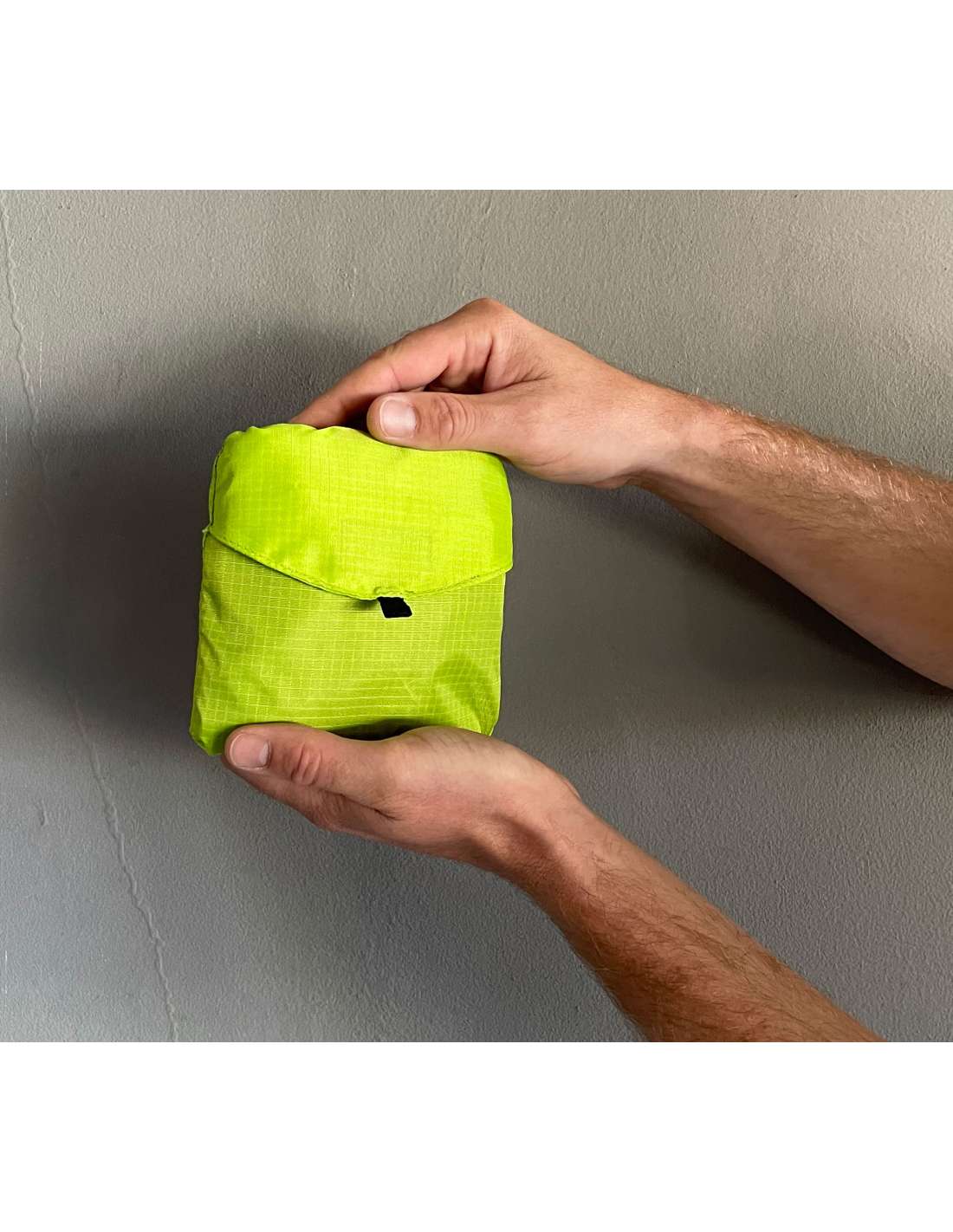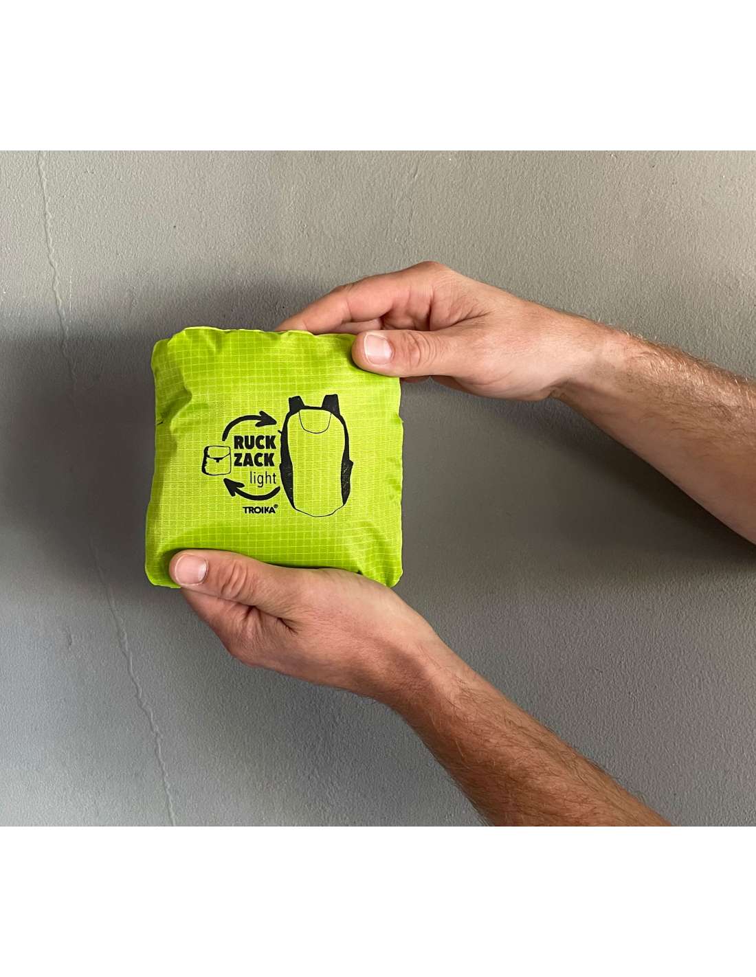 Sac à dos pliable (se range dans le compartiment intérieur pour gagner de la place), grand compartiment principal avec fermeture éclair, petite poche intérieure avec fermeture velcro, 2 poches en filet pour bouteille et parapluie, bretelles réglables en longueur, capacité d'environ 18 litres, capacité de charge jusqu'à 6,5 kg, ultraléger : ne pèse que 115 g, 100% polyester, polyester, noir/vert