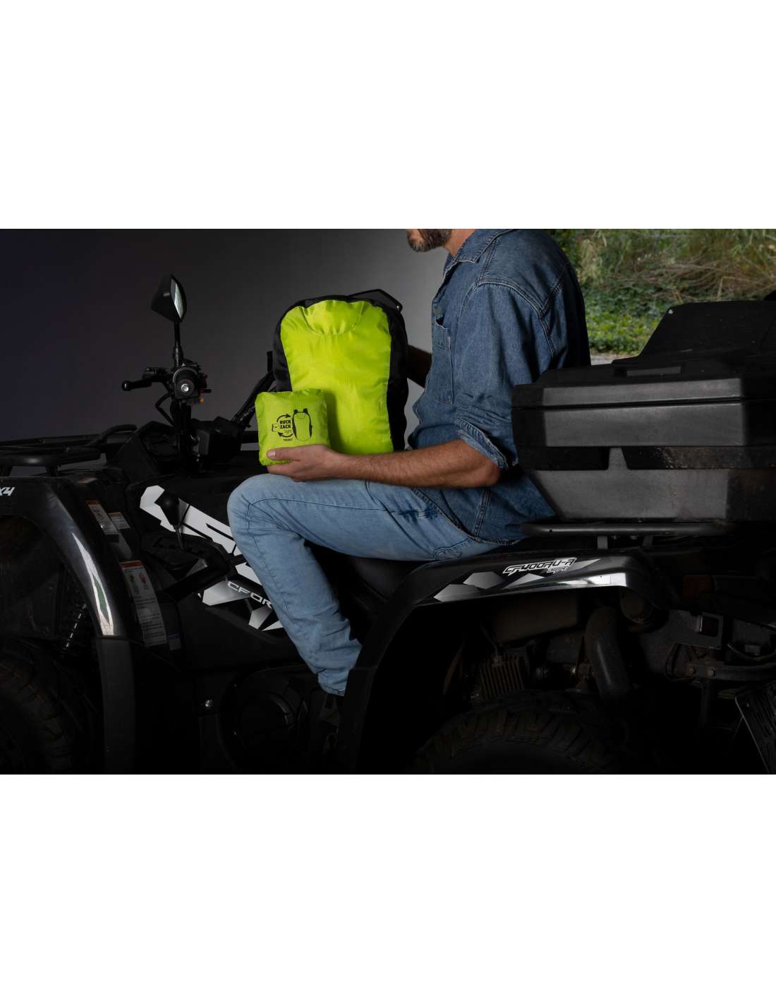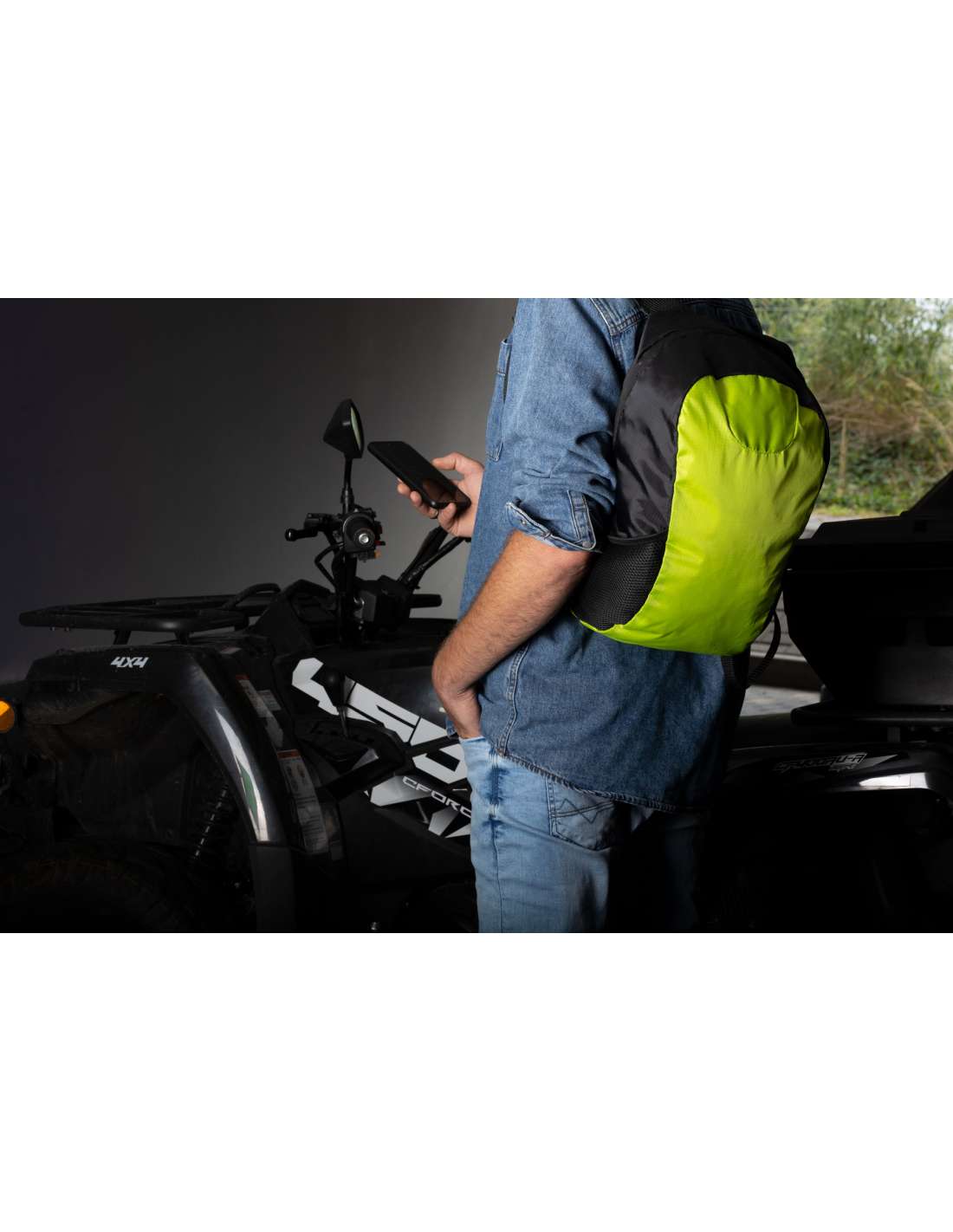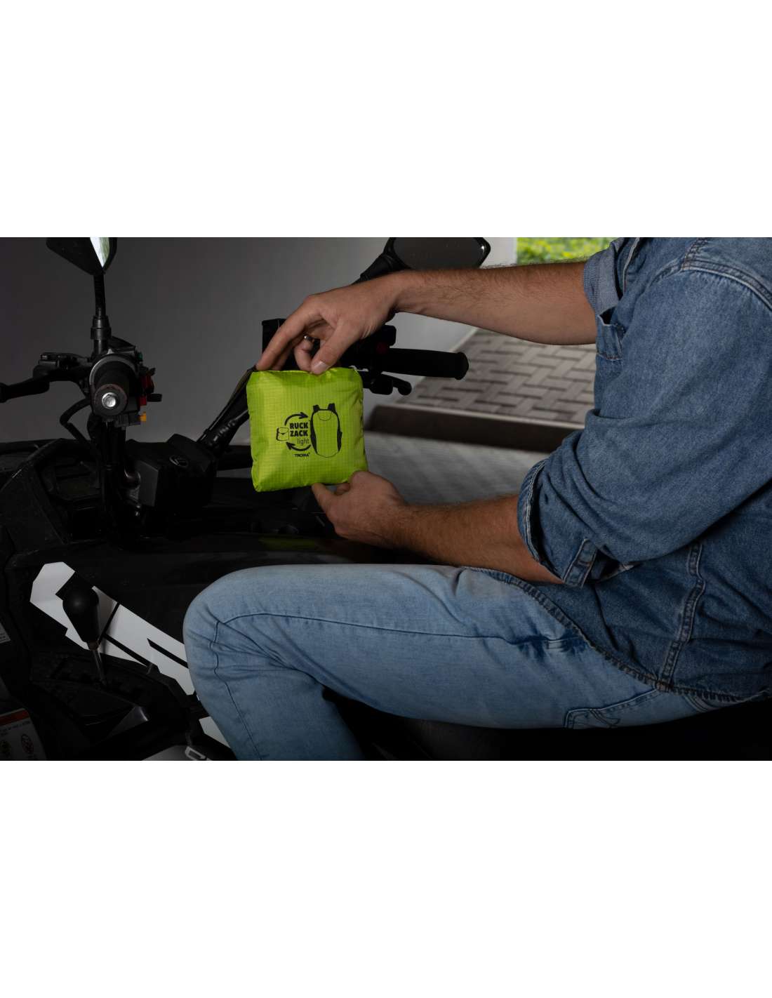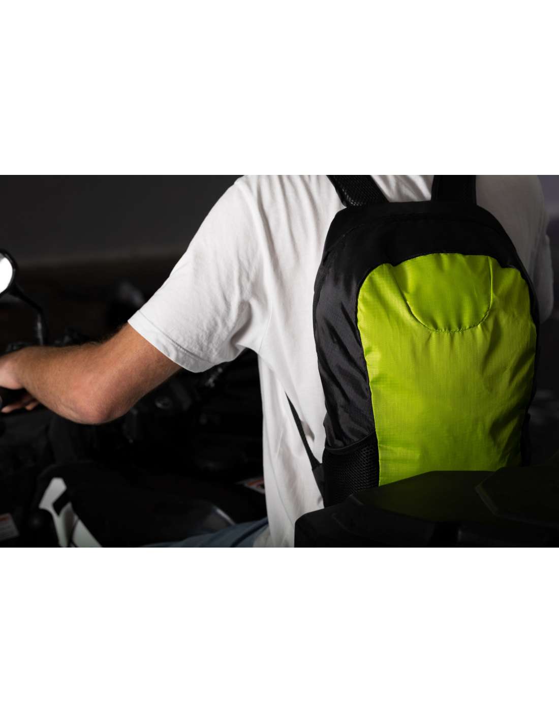 Sac à dos pliable (se range dans le compartiment intérieur pour gagner de la place), grand compartiment principal avec fermeture éclair, petite poche intérieure avec fermeture velcro, 2 poches en filet pour bouteille et parapluie, bretelles réglables en longueur, capacité d'environ 18 litres, capacité de charge jusqu'à 6,5 kg, ultraléger : ne pèse que 115 g, 100% polyester, polyester, noir/vert