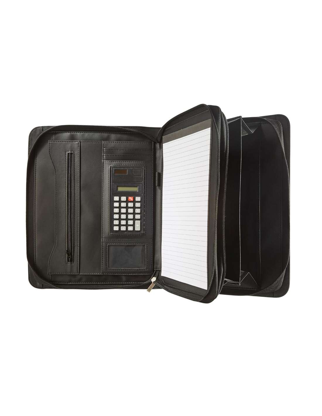 Ce conférencier avec fermeture éclair a une couverture noire luxueuse. Un bloc-notes ligné A4 est fixé à droite. Sur le côté gauche du conférencier en similicuir, il y a une calculatrice et un espace supplémentaire pour stocker des notes et des feuilles. cela garde vos affaires rangées et à portée de main. Le conférencier a une fermeture éclair et 2 compartiments. Simple et organisé en réunion.