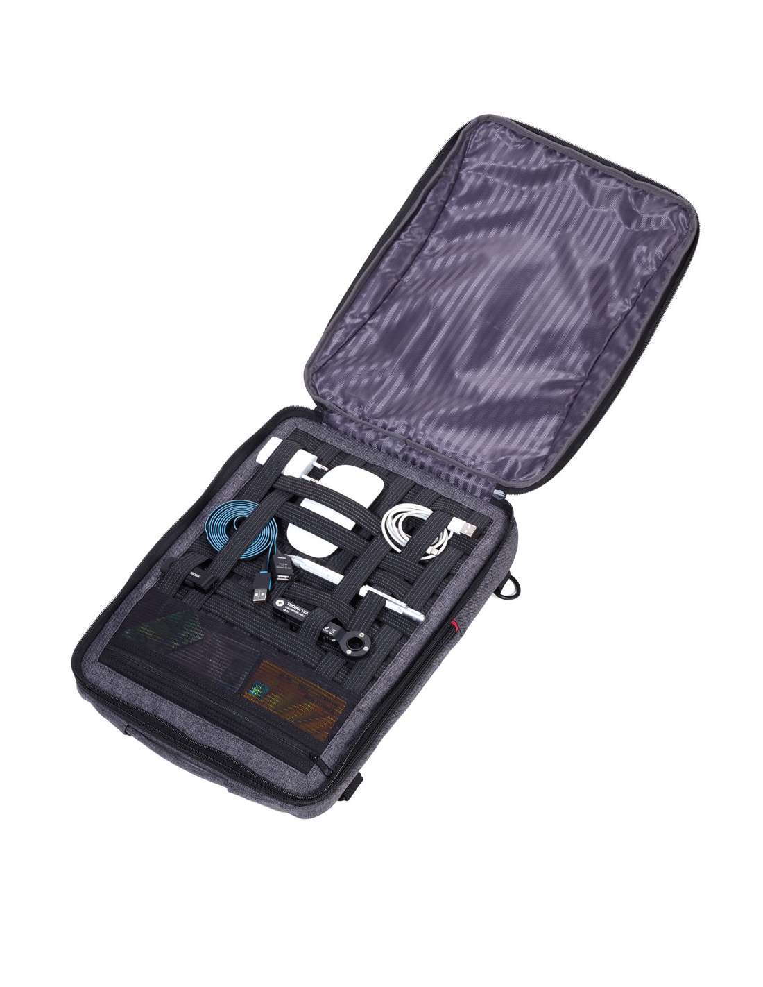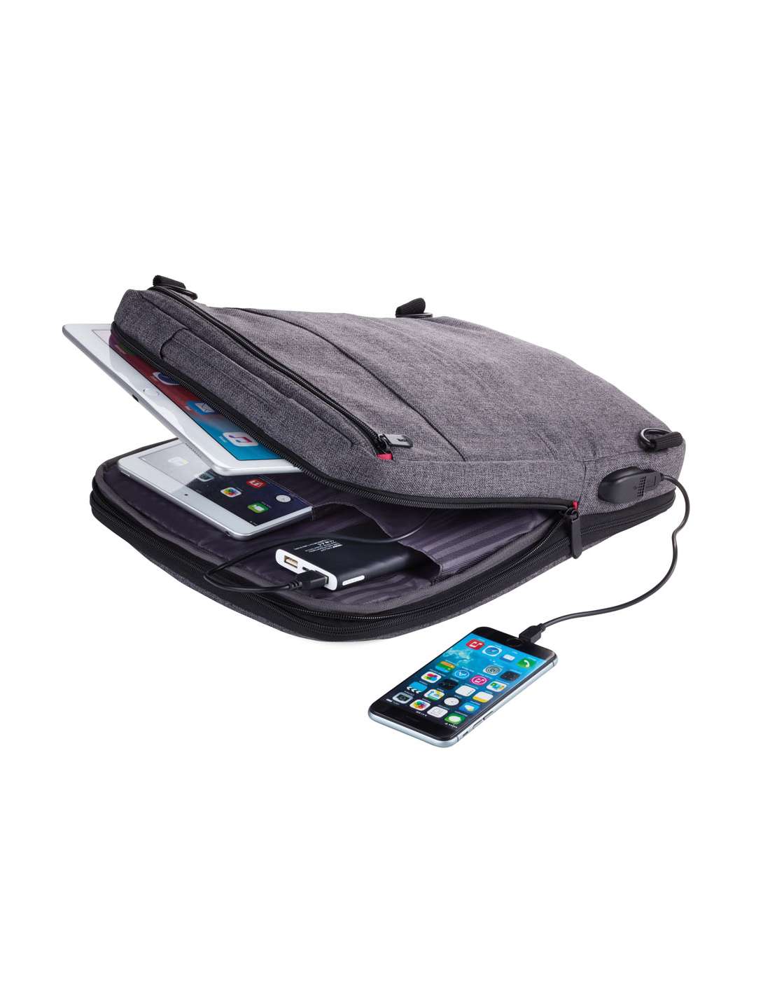 Sac à dos professionnel pour charger des appareils électroniques, 1 compartiment pour documents, ordinateur portable, tablette (jusqu'à 13''), 1 compartiment élastique pour accessoires (Every Day Carry), 1 compartiment à l'arrière, rangement, bandoulière rembourrée, boucle élastique pour fixation au chariot, câble USB intégré, entrée + sortie, polyester, anthracite/noire