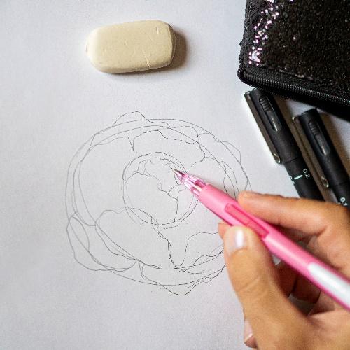 1ère étape : Créez un contour. Commencez par dessiner à main levée une forme ronde au centre entourée de 2 formes ovales à l’aide du portemine Shalaku.