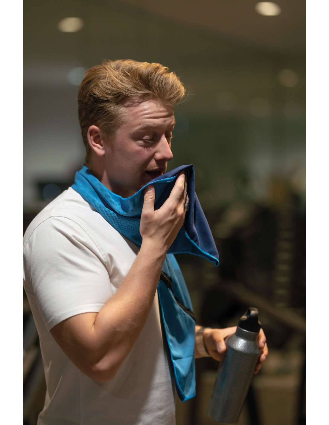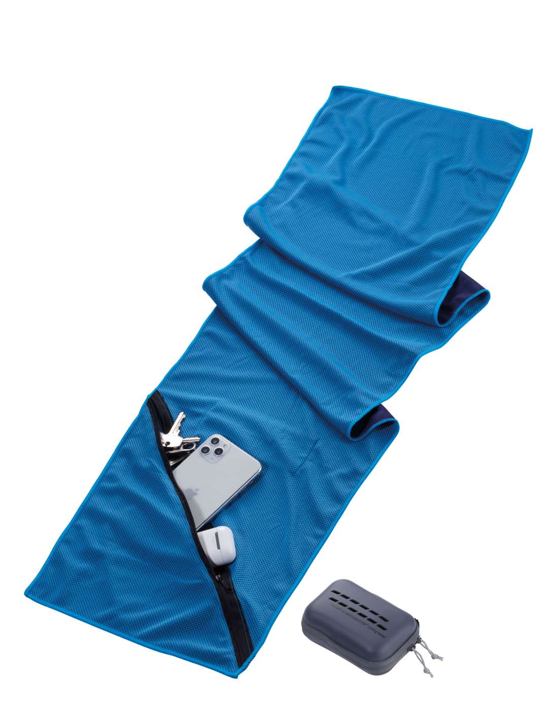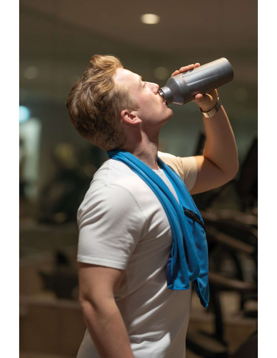 Serviette de fitness qui facilite l'absorption de l'eau grâce à la structure alvéolée de la microfibre, poche zippée extra large pour smartphone, clés, écouteurs, cartes, argent, etc., super absorbante, séchage rapide, l'humidité active ses propriétés naturelles rafraîchissantes, sangle à l'arrière (de longueur réglable), peut être utilisée comme serviette, foulard, écharpe ou masque, rangement peu encombrant pratique pour les déplacements grâce à une boîte perforée de petits trous, microfibres, bleu clair/gris