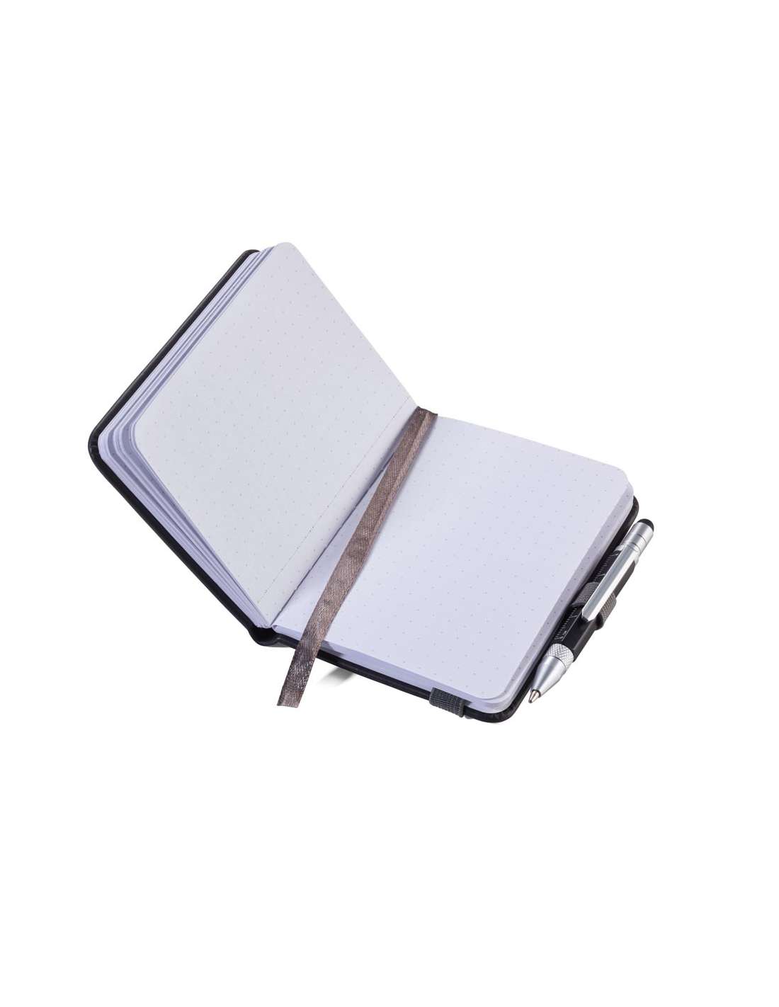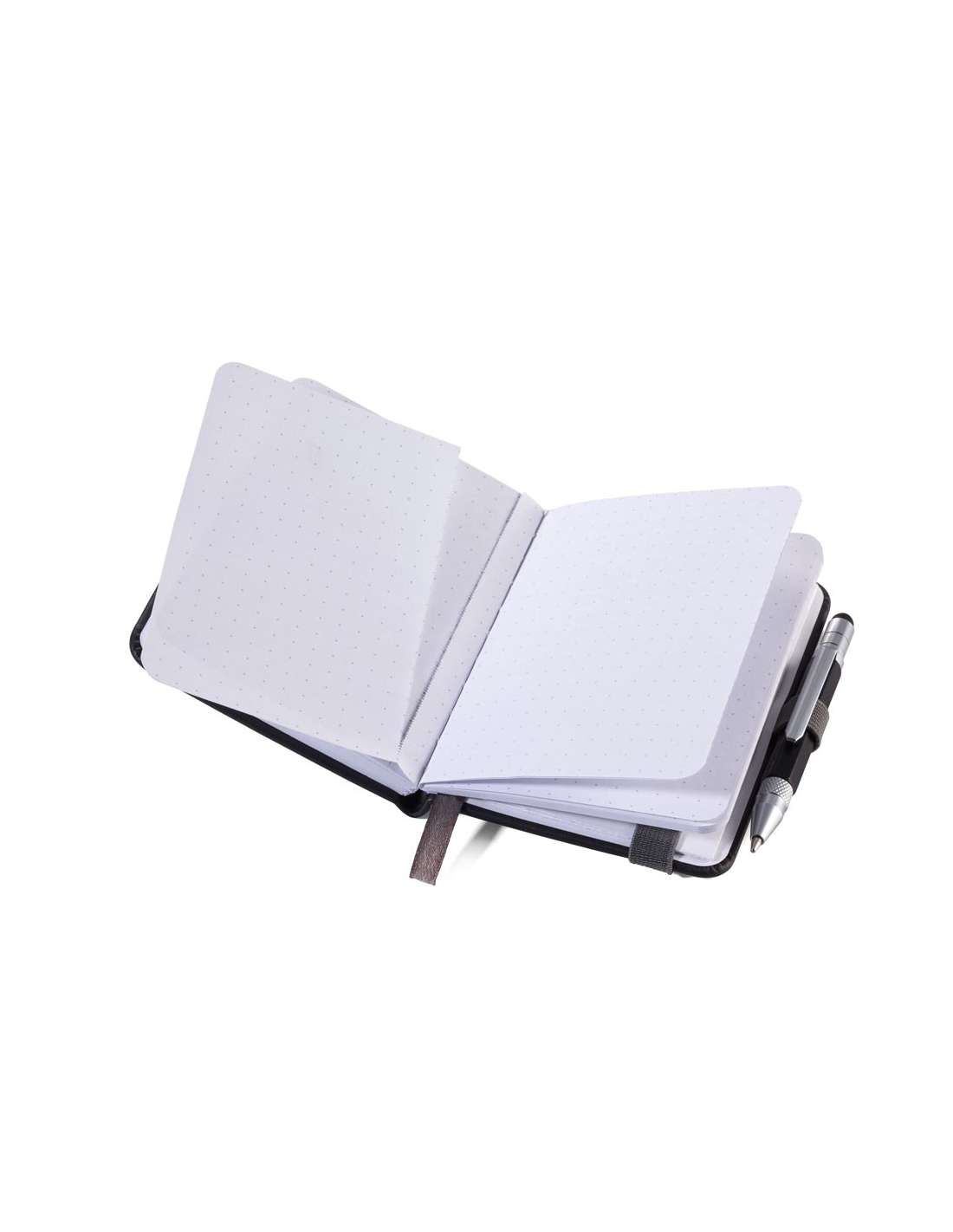 Bloc-notes DIN A7 incl. stylo à bille, fermeture à bande élastique, boucle de stylo, signet, règle en relief (10 cm) sur couverture, papier certifié FSC, côtés perforés, matrice de points, compartiment pour les documents, stylo à bille multitâche CONSTRUCTION LILIPUT (petit), mine noire, métal, similicuir, mat, noire